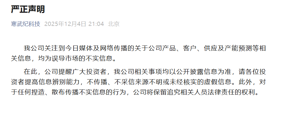 12月4日晚,寒武纪在微信公众号发表严正声明称,公司关注到今日媒体及网络传播的关于公司产品、客户、供应及产能预测等相关信息,均为误导市场的不实信息。